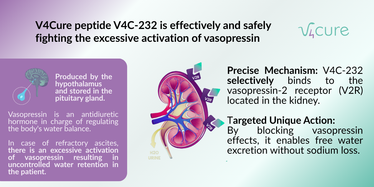 El V4C-232 ofereix una alternativa més segura derivada biològicament amb el potencial de millorar els resultats dels pacients i establir un nou estàndard d'atenció en ambdues indicacions. V4Cure té els drets globals exclusius de dues famílies de patents que cobreixen l'ús del V4C-232 tant en ascites refractària com en la malaltia poliquística.