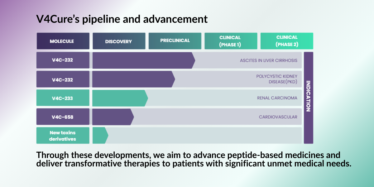 Tot i que V4C-232 és el primer actiu clínic de V4Cure, la nostra plataforma de descobriment dóna suport al desenvolupament d'una àmplia cartera de pèptids derivats del verí, inclosos candidats dirigits al càncer renal metastàtic i a les malalties cardiovasculars.