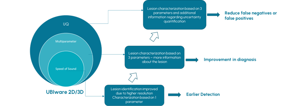 El desarrollo de nuestro primer producto UBIWare se ha diseñado de forma escalonada, de manera que la primera versión del producto se validará como herramienta de reconstrucción de imagen mamaria, que permitirá una posterior validación clínica regulatoria como método de diagnóstico de cáncer de mama, sobre el cual se irán añadiendo funcionalidades que permitirán aumentar las mejoras en la detección e incluso seguimiento de la enfermedad, gracias a la reconstrucción multiparámetro y la cuantificación de la incertidumbre.