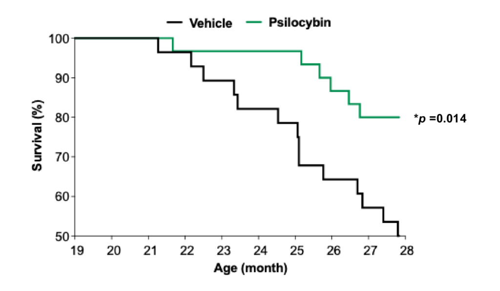 En los experimentos in vivo, realizados con ratones hembra envejecidas (en el mundo de los ratones esto son 19 meses, equivalente a unos 60–65 años humanos), los pequeños roedores recibieron psilocibina una vez al mes durante 10 meses. El 80% de los animales tratados sobrevivieron hasta los 28 meses, frente al 50% del grupo control, y además mantuvieron un pelaje joven hasta sus últimos días (aunque eso, admitámoslo, fue difícil de cuantificar).