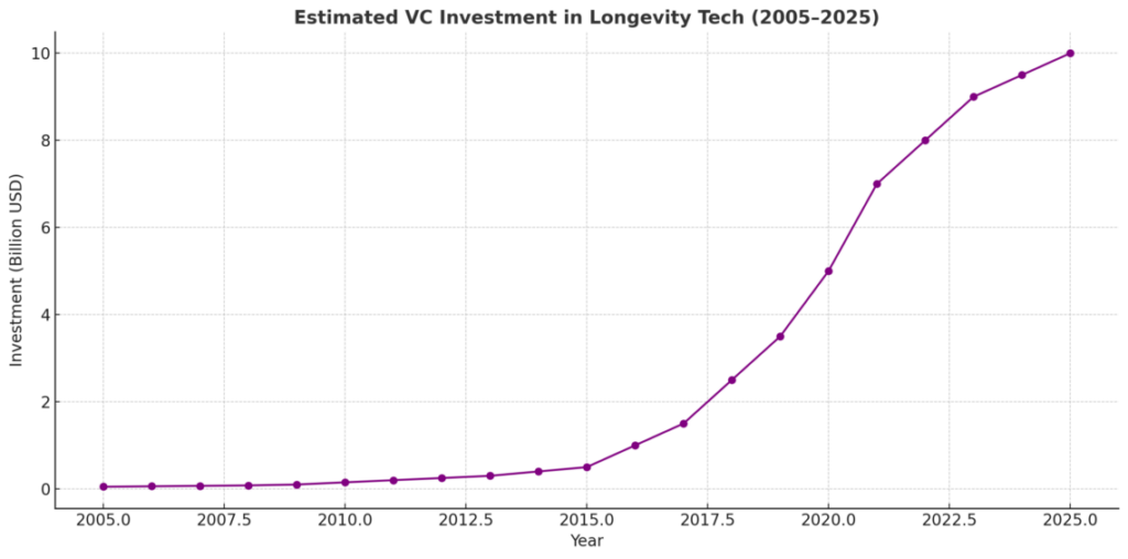 La inversión total de capital riesgo (“VC”) en longevidad en el año 2000 fue inferior a 100 millones de dólares, lo que es básicamente nada. Doce años después, en 2012, se acercó a los 200 millones de dólares, que es el doble de nada. Pero doce años después, en 2024, superó los 9.500 millones de dólares, casi 50 veces más.